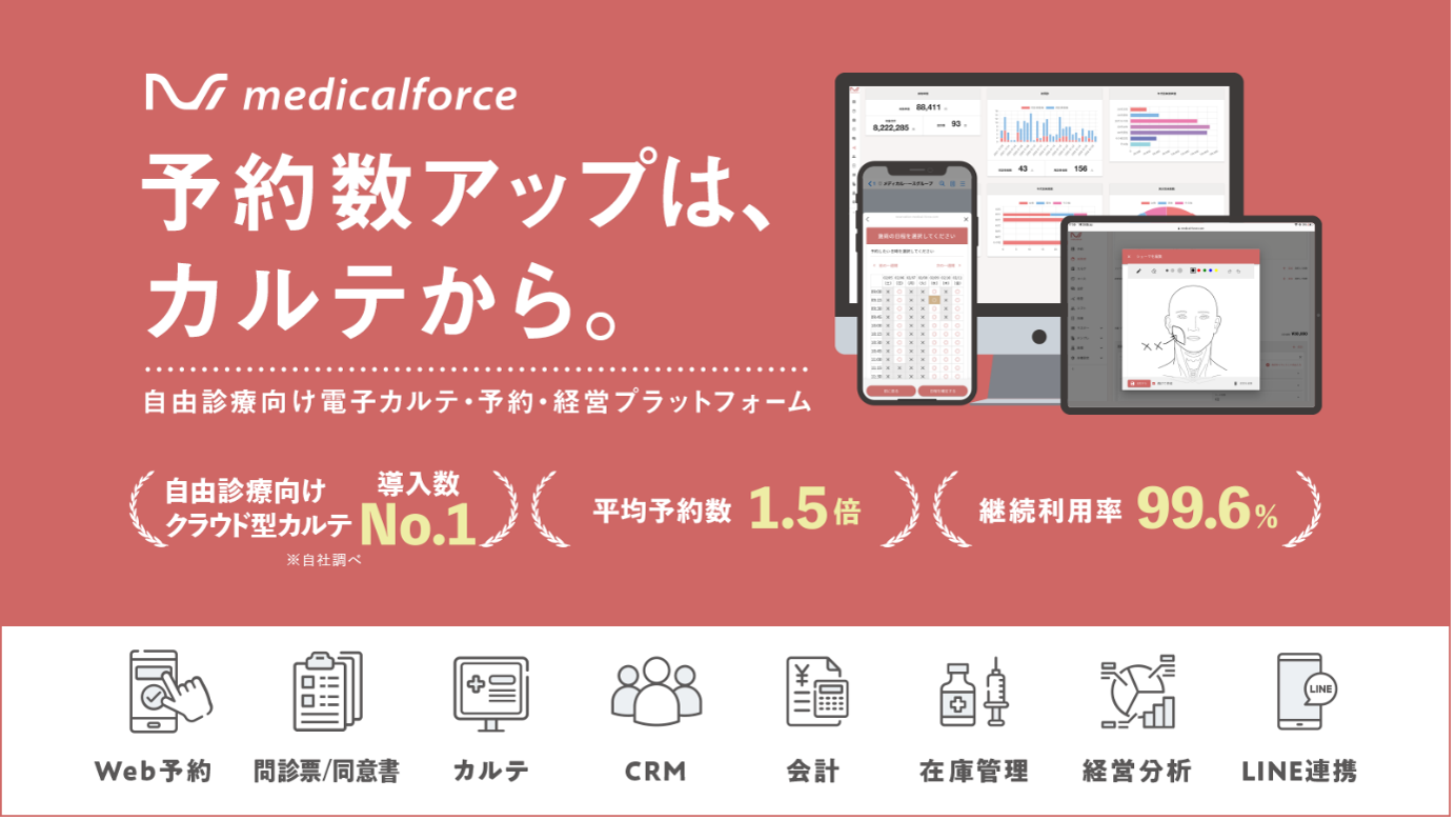 「medicalforce」は、自由診療クリニック向けオールインワンSaaSです。電子カルテ、予約管理、会計、在庫管理など、クリニックの業務フローに沿った豊富な機能により業務を効率化できるのはもちろんのこと、予約枠の最適化やLINE連携など、予約数の増加や売上向上を実現するための機能が充実しています。規模や診療科目を問わず、400院以上の自由診療クリニックで選ばれ続け、この度、「美容クリニック向けクラウド型電子カルテ導入院数」でNo.1のシェアを獲得※1いたしました。