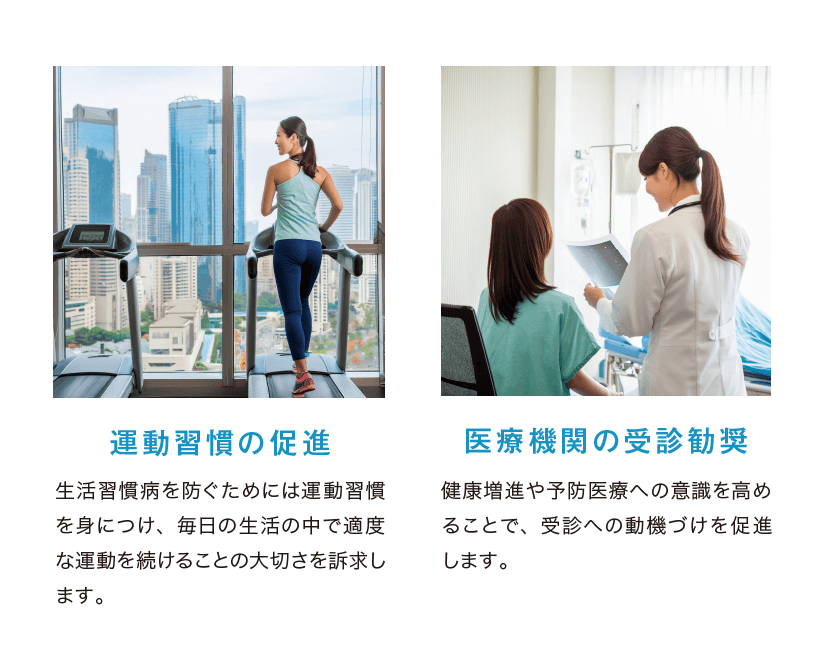 トレーニングスペース内のサイネージでは健康維持や運動奨励に関する情報、個室ブースでは、医療記事やクリニック情報など、それぞれのシーンに合わせた情報提供を行ってまいります。