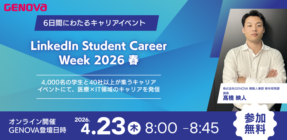 株式会社GENOVA(本社:東京都渋谷区、代表取締役社長:平瀬智樹/以下:GENOVA)は、日本最大級のキャリアフェス「LinkedIn Student Career Week 2026 春」において、当社採用担当が登壇することをお知らせいたします。