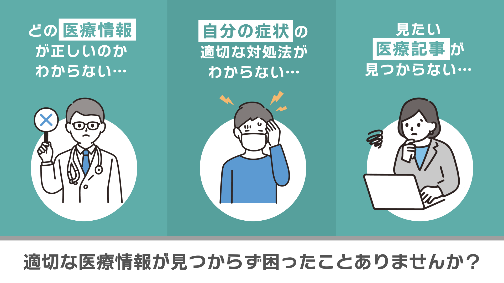体の悩みは人によってそれぞれ違い、多くの医療情報の中からその人に合った病院やクリニック、ドクター、医療情報を見つけることは容易ではありません。「どの医療情報が正しいのかわからない」「自分の症状の適切な対処法がわからない」「見たい医療記事が見つからない」といったユーザーに対して、専門の医師・歯科医師たちが各々の立場から名前付きで、医療情報を提供します。回答は医師の監修を受けた情報なので安心です。