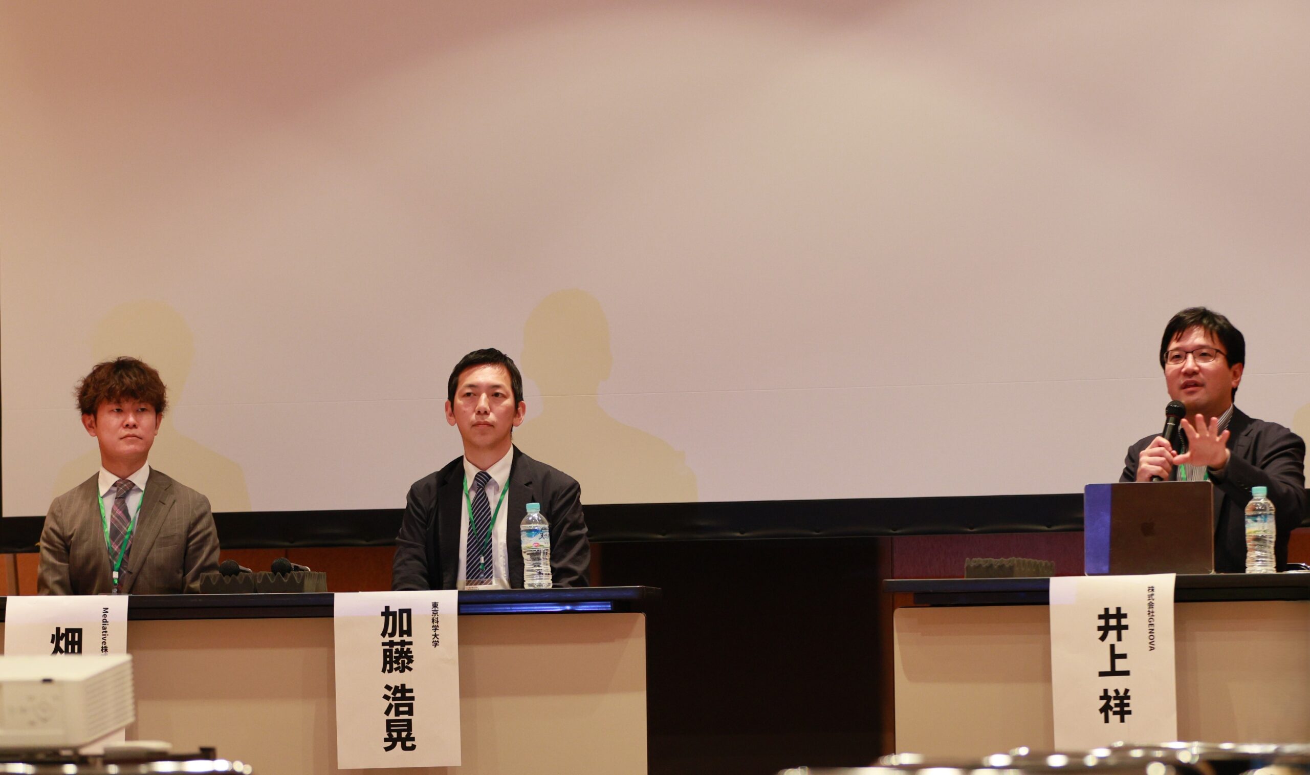 登壇者は、デジタルヘルス領域の第一人者である加藤浩晃氏、臨床の領域で活動する畑拓磨氏、そして横浜市立大学 共創イノベーションセンター特任准教授/京都大学客員研究員であり、当社取締役執行役員を務める井上祥の3名。会場は満席となり、医療者のキャリアの多様化に対する関心の高さが伺えました。